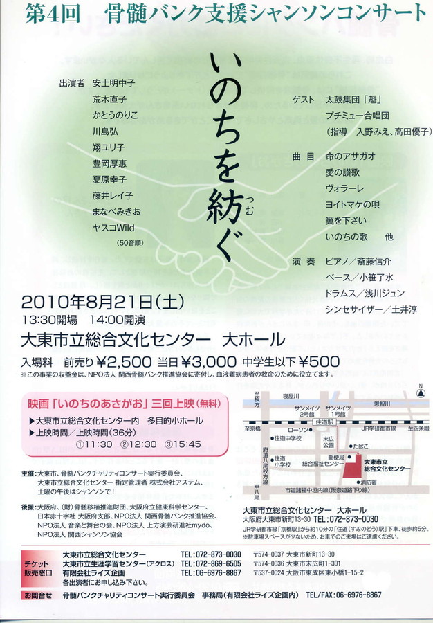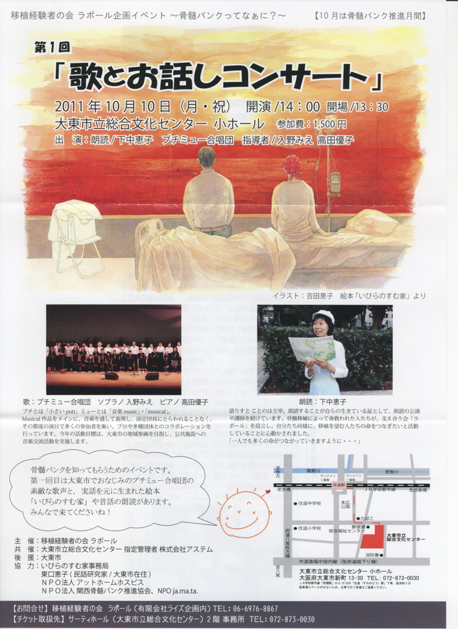 2011年10月10日祝日に大東市立総合文化センター小ホールにて「歌とお話しコンサート」を開催致します。