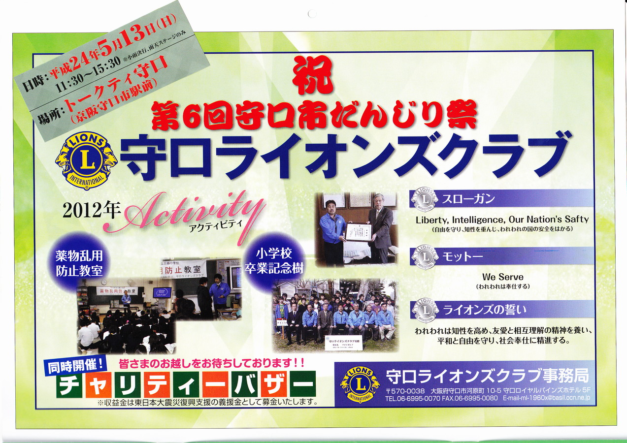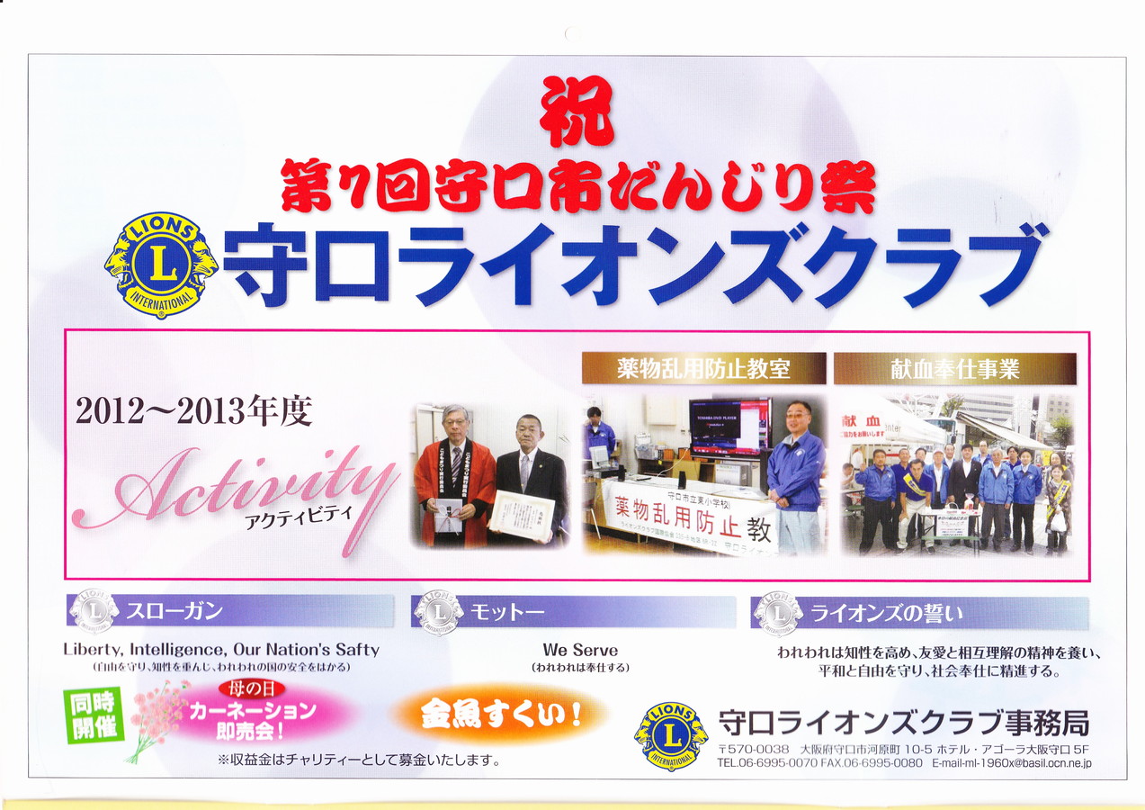今年もだんじり祭に守口ライオンズクラブは協賛しています。当日は母の日ですのでカーネーションの販売致します。子供達には金魚すくいを用意しています。