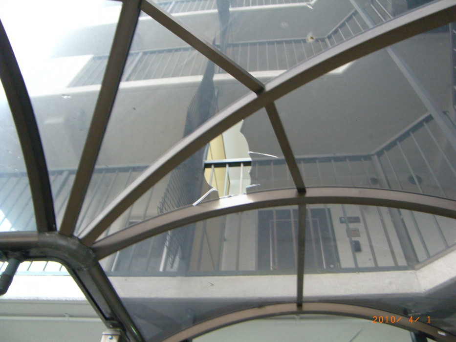 マンション1階通路テラスに上部階からの落下物により破損の為、ポリカ板に張替えました。