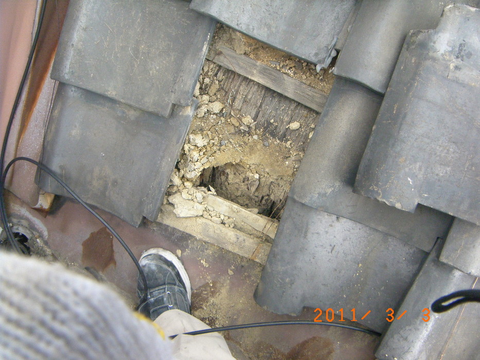 最近雨が降ると良く漏るので見てほしいとの依頼が有ったのでいざ屋根に登って見てびっくり、瓦がズレていて完全に治すには葺き替えなければいけないのですが予算が無いとの事とりあえず応急修理をしました。